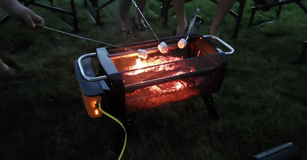 Being dual purpose, the firepit’s fuel rack can be raised up, and instead of logs, load it with charcoal for grilling a meal. There’s an included grill grate that holds enough food for 2-4 people, depending on what you’re cooking. Heat and flame size can be managed via the fan speed. For tech geeks, there’s even a free app for that. While most of us probably prefer not to use our phones when we’re chilling outdoors, it can charge one, or other USB devices. More specifically, your Bluetooth speaker that’s playing those relaxing tunes as you enjoy some quality time outdoors. Or just enjoy the crackle of the fire.
