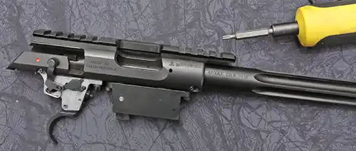 CZ makes barrel swaps for their 455 and 457 rifles very simple. With the barreled action out of the stock or chassis, you can see the two grub screws which hold the barrel in place. Although that magwell does need to be loosened to swap the barrel, it’s those two grub screws which need to be backed out for the swap. Back them out a few turns, and the OEM barrel should pop right out. Install the BoreBuddy barrel, and torque the screws to 30 in/lbs. Carefully snug down the magwell screws and install it back in the stock or chassis.