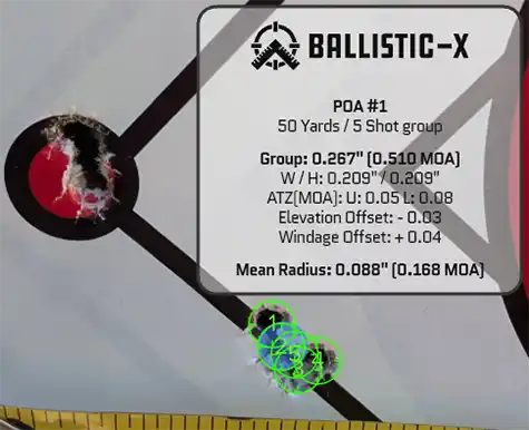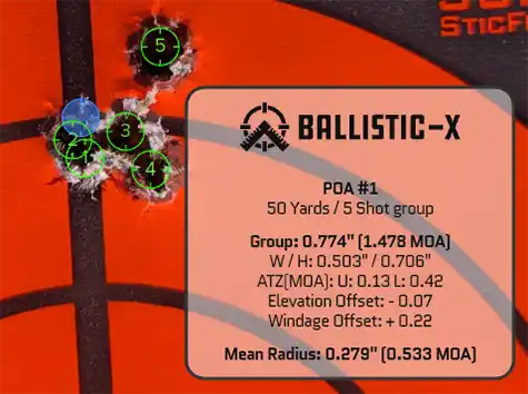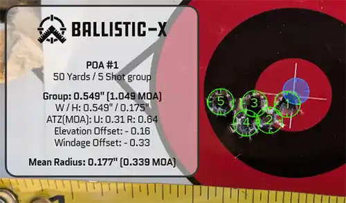 At this point, I was a little frustrated. I’d passed my usual timeline for completing a review, and knew something was off, just not sure what it was. My targets are peel-and-stick and are custom-printed by a neighbor. With either bright orange or green, they have plenty of contrast. But it wasn’t until I tried plain black on white that my groups got smaller.