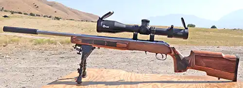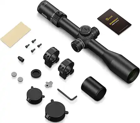 Weighing 35.5 ounces, it’s a bit heavier than scopes of similar magnification and objective, probably due to the 34mm (vs 30mm) main tube. Included in the package are flip-up lens caps, scope rings, a sunshade tube, throw lever, two CR2032 batteries, lens cloth, wrenches, and a user manual. It’s positioned as a scope for hunting, benchrest shooting, or long-range target practice. That’s an impressive set of features, but the goal is to deliver premium performance at an accessible price point.