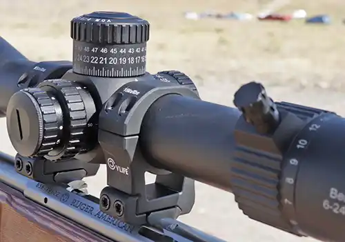 In the cons list, I have a few things that may or may not matter to other users. The included rings may be too tall, which in itself isn’t a big deal. But the 34mm main tube means high-quality rings are going to cost more than similar-quality 30mm rings. And the fact that it weighs about 1/4 pound more than similar scopes isn’t a concern when shooting supported. The final, minor issue is the parallax. For rimfire, it would be great if it went down to 10 yards. None of these are dealbreakers, I just wanted to mention them.