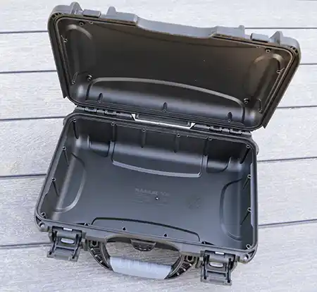 Popping it open, there is a tall lip on the lower half that fits into a deep groove in the lid. Riding in that groove is a pliable gasket. Combined, the groove and gasket contribute to an IP67 rating. That 6 indicates no solids, down to fine dust, can penetrate the closed case. And the 7 denotes its water protection level. The NANUK-R 909 can withstand being submerged in a meter of water for up to half an hour. Of course, it will float too, unless you exceed its buoyancy rating of 12.9 pounds/5.8 kg.