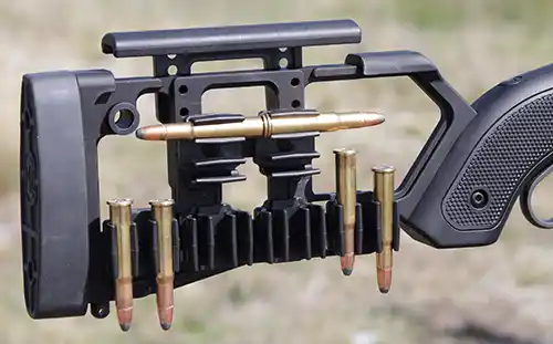 Since I was already working on this end of the rifle, I took a few minutes to add the Shell Holder Plate. This mix of aluminum and polymer allows me to carry an extra dozen rounds of .30-30 on the stock itself. It attaches to the M-LOK slots on the stock, and it’s really solid, even when loaded with ammo.