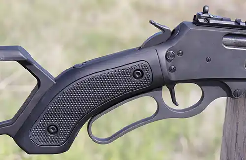 Designed for Marlin lever action rifles with pistol grips stocks, it also works with Rossi R95 rifles of a similar design. Midwest Industries manufactures these from 6061 aluminum with a hardcoat anodized finish. The design includes plastic grip panels (there are G10 upgrade options) and a nice rubber butt pad that minimizes felt recoil. There’s a polymer cheek riser that is height-adjustable. At its lowest setting, it’s the same height as the OEM stock, yet it’s adjustable for optics and scopes.