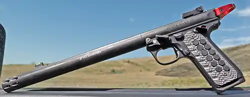 While stubby, suppressor-ready Ruger Mark IV barrels have been popular lately, I went the opposite route with the 10″ stainless steel match barrel from Volquartsen. This 10″ long by 1″ diameter barrel is built on a genuine Ruger OEM receiver. It’s a beast of a barrel, but also a unique and gratifying shooting experience.
