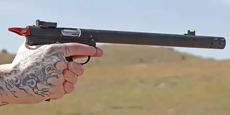 Despite the weight of the barrel, it doesn’t feel as front-heavy as expected. And it negates any recoil a .22 pistol might have. Shot after shot, it just stays on target. That huge sight radius is about the same as a CZ Scout rifle’s. The result is a pistol that shoots more like a rifle. At 25 yards, I can just hammer away at a 4″ swinging steel target over and over. Having a light trigger helps, but it’s a bit uncanny the way the pistol doesn’t seem to move at all.