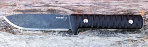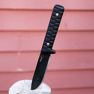 Designed by Sé¡ndor Hegyes, of Hungary, this knife is all business. Sé¡ndor’s specialty is no-frills practicality. For the Bushcraft Kormoran, that means hard G-10 handles with deep grooves and fine texture. It also means a .20 inch thick, 9.6 inch long slab of Sandvik 14C28N steel. Of that, 4.7 inches is the blade itself. A black stonewash finish complements the black handles, which attach with silver hex head hardware. The only other shiny bit is the edge of the blade itself. Nothing fancy here, but the overall look is attractive.