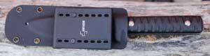 If you look closely at the photos, you’ll notice it extends a bit past the handle. There is just enough exposed steel to use for light hammering chores. Recessed cuts in the handle allow room for a lanyard to be threaded through as well. The Kydex sheath includes a belt adapter too, which I found somewhat awkward, but still usable.
