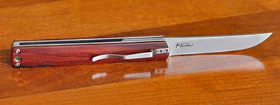 With its 2.8″ long, 0.10″ thick 440C blade, the 6.9″ long (open) Wasabi weighs a mere 1.6 ounces. Complementing the time-honored Japanese style blade is genuine cocobolo for the handles. Angled cuts plus nice grain patterns add visual interest. Inside, it gets smooth ball bearings which work well for this flipper. Although it doesn’t lock open, a slip joint and detent ball hold it open better than no lock at all. Rounding it all out is a milled pocket clip which is not reversible. Should you want to take it apart for cleaning, or if anything loosens up, a small wrench is included.