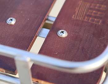 Polished stainless steel not only looks great, but is quite strong. Yes, aluminum might save a few ounces, but it’s a rack for carrying cargo. So strength and durability are first and foremost. Besides, whatever cargo you’re carrying will far outweigh those few ounces. All the hardware seems to be stainless too. Polished screws with polished washers up top. To complement that stainless steel, the slats are wood, stained a medium brown. I’m a little disappointed that the stain wasn’t applied evenly on the edges, but it’s not a dealbreaker. Overall, it’s a very stylish look, and suits my bike well.