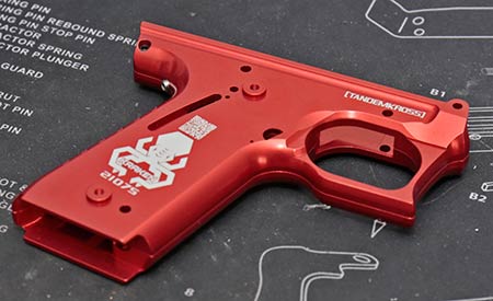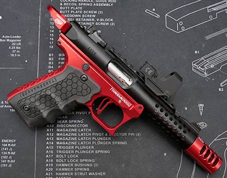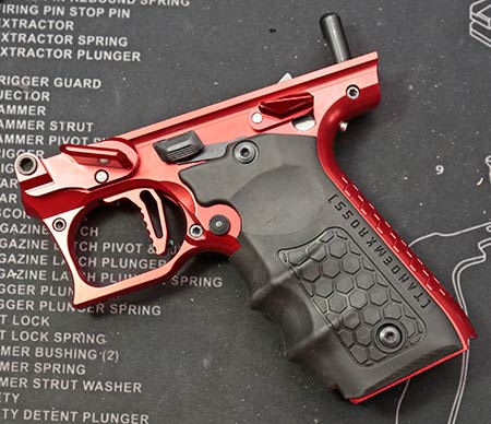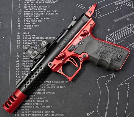 This is the first aftermarket lower for the Ruger Mark IV 22/45 that I am aware of. It’s available in red or black, and takes all factory and nearly every aftermarket accessory. They can’t say every single aftermarket part will work, because there may be some that don’t. Unlikely, but there’s always a small concern. For what it’s worth, all my aftermarket parts fit just fine.