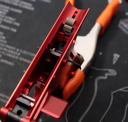 It helps to read all the way through the instructions once or twice. I also borrowed my wife’s tablet so that I could scroll through at my bench. Each step was clear, and easy to follow. Where I got tripped up a few times was the very first step – installing the frame lug and lug screw. I have the Striplin Custom Gunworks forward thumb ledge (gas pedal). This part has the lug screw. but is also the pin for the trigger. So I had to take a step back when it was time to install the trigger and the rest of the parts in the front of the upper. Installing the sear, easily the worst part previously, was actually easier. TandemKross added an extra hole to the lower, and one of the included hex keys fits through it, holding the sear in place. Guiding the spring in was the hardest part, and even that was easy.