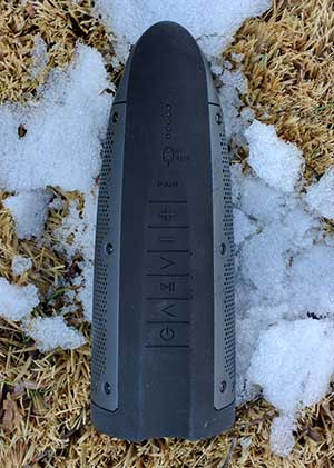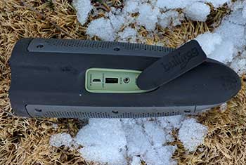 Under a rubber cover are the AUX in, standard USB charge out, and micro USB charge ports (cable included for charging). Plus a reset button. Having that AUX in option is nice, as I can use it with my waterproof iPod Shuffle, which lacks Bluetooth. Although the Bullfrog runs 12 hours on a charge, using the USB out to charge your phone will cut that time by quite a bit. So that feature is best reserved for emergencies.