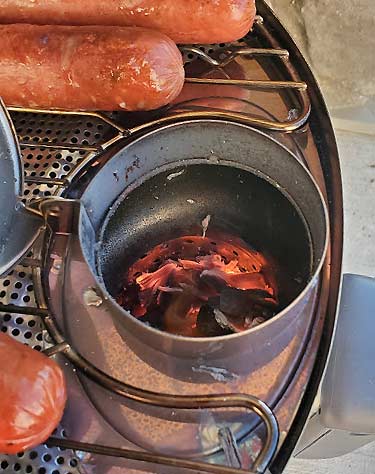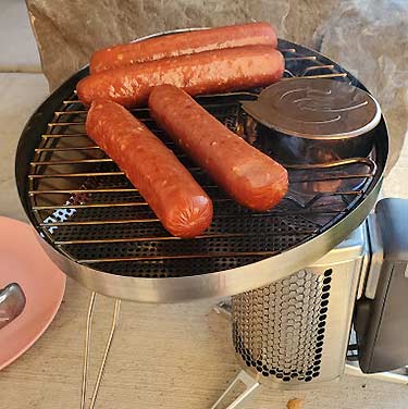 Having used the original CampStove for boiling water, it’s obvious I was more interested in the grill. So I grabbed some dead grass and leaves from my yard, and a bag of mesquite wood chips. Once the grass and leaves caught fire, I turned the fan on low. This provided just enough air circulation to get the fire going. As the chips started to burn, I threw in some more, and turned up the fan. It took some adjusting of the amount of chips and fan speed to get it just right. I didn’t mind the extra smoke though, as it was jalapeno beef brats that I was cooking. Once dialed in, it worked great, with my smoky-flavored brats grilled to perfection. We repeated this with hot dogs as well.