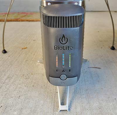 Inside the CampStove’s module is a four-speed fan. There are LED lights that show fan speed, rate of charge, and state of the 2600 mAh internal battery. A thermoelectric device pokes out of the module, and into the stove. That’s the part that converts the excess heat into electricity.