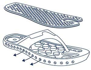 The perforated insole can be removed from the shoes for cleaning or to swap in a new color. In addition to keeping sand and water buildup out of shoes the perforation also delivers cooling air-flow to the feet. Wearing VENTOLATION shoes is essentially like standing on air. The columns inside the shoe are spaced apart resulting in less material under foot and rotary ventilation of air. Instead of sweating and suffocating feet are allowed to breathe comfortably.