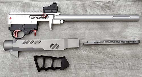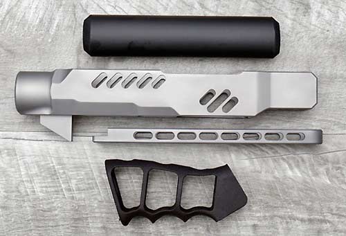 As expected, this chassis starts off as a billet of 6061-T6 hardened aluminum alloy. Everything you don’t need is machined away, leaving you with an 8.4oz chassis. Even at that low weight, it’s got some smart features. A weight-saving set screw eliminates the need for a castle nut on your receiver extension. An accuracy-improving adjustment screw provides a second mounting point for the receiver (more on this later). It’s got a grip spacer to make a smooth transition from an AR style grip to Ruger trigger guard. There’s a cap for the front, if you don’t want to use a handguard.