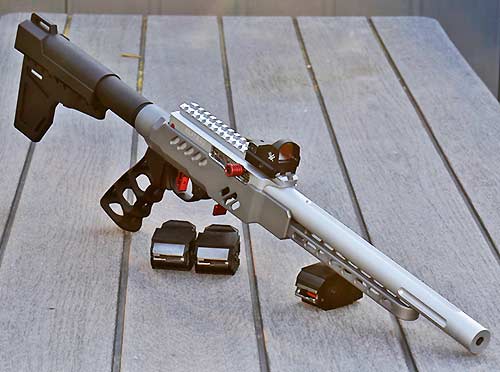 In addition to the Crazy Ivan components listed above, I used a variety of mostly aftermarket parts. The receiver is a Tactical Innovations Elite22™billet aluminum receiver in “Stainless” clear. My 12″ fluted, threaded WhistlePig barrel is attached with a stainless v-block set, also from TI. Inside, I swapped a JWH Custom bolt out of another rifle, since it’s got the American flag engraving. Below that is a standard Ruger trigger housing, but it’s got a few upgrades. TandemKross provided the red Victory trigger, KrossPins, and bolt release. **Note that WhistlePig is now known as Acculite22.com.**
