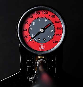 Yes, it’s all about that base. The original Pista was designed to be used with a single foot. While this made it a bit more compact, it wasn’t super stable. So the Plus here is for the extra stability from the new base, which allows for both feet, if desired. Note the high contrast, 220 PSI face on the large 64mm gauge as well. It’s accurate to within 2%, and very readable.