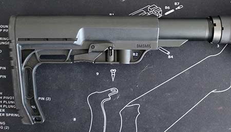 Out back, I decided to use a Battlelink Minimalist Milspec Stock from Mission First Tactical. At 5.8 ounces, it’s fairly light. And I really like the minimalist profile. Just as important, it’s adjustable, locks up solid, and doesn’t rattle (Listen up, Magpul!). It’s got slots for a sling, plus a quick-detach mounting point. Oh, I got the black one, of course. SKU is BMSMIL, MSRP is $59.99, and it was another part I had, waiting to be put to good use.