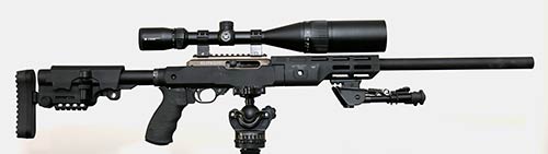 Back in September, I shared my Midwest Industries chassis project. As a 10/22-based Charger build, it was a fun project. I even went through the trouble of having the 10″ KIDD steel .920″ barrel threaded. That helped a bit with the AR theme. As much as I liked it though, it was quite heavy for a Charger. So I started rounding up parts for a rifle build using the same receiver and chassis. I ended up with an A*B Arms Urban Sniper Stock X™out back, and a 20″ WhistlePigGunBarrelCo barrel up front. **Note that WhistlePig is now known as Acculite22.com.** Then I swapped the grip, and topped it with a spare scope I had. The result is shown below.