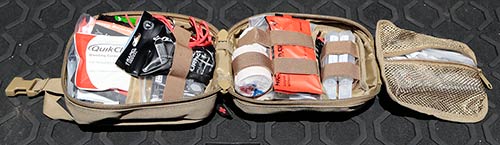 All these items are stored in a perfectly-sized bag. I hang it off the back of the rear seats in my FJ Cruiser. That’s keeps it out of the sun, but visible to everyone who goes shooting with me. Because quick, easy access is important for first aid. Especially in an emergency. You can see in the photo below how it unfolds to provide access to the well-organized contents.