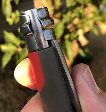 Which brings us to the locking ring. This definitely feels like a late 19th-century solution, even if it was introduced in 1955. It‘s just a shaped strip of metal bent around the neck of the handle with a small gap. When it is turned away from the handle cutout it locks the blade in place, either closed or opened. Certainly sturdier than a slip joint, clasp lock, or lever lock. It’s a lot simpler design than these or frame locks or lockbacks. It’s also a bit more cumbersome, and in a brand-new knife, it takes a bit of force and learning to engage and disengage it one-handed. But that‘s okay because this is an Opinel. This is not a knife for flicking open off of a belt clip with a spring release.