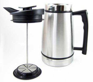 In our quest to brew the perfect cup of coffee, we found the French Press with Brü-Stop from Planetary Design. This double-walled, 18/8 stainless French press has a patented feature that sets it apart from the average press. But it would be a shame for just one person to enjoy. Which is why we chose the 48 ounce size, so we could enjoy great coffee with friends at work. And it certainly filled the role of providing hot and fresh coffee for us.