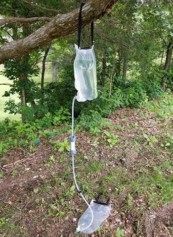 The Platypus GravityWorks 4 Liter System weighs 11.5 ounces, so I don‘t think you‘d carry it on a solo backpacking trip. Platypus makes other versions of the system that are much lighter if they better suit your needs. When I squeezed everything into the included stuff sack, the test filter measured about 5 ½ by 2 by 10 inches, so pretty small. Webbing straps with buckles are fastened to both reservoirs for hanging so you don‘t have to have rope with you.