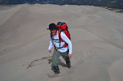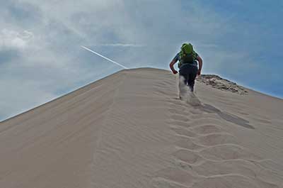 As I slogged into a 15mph breeze among North America‘s tallest sand dunes, my every footfall kicked up a cloud of fine sand which was caught by the wind and carried back into my lower legs. Until the serious climbing began, I felt a little thrill with every footfall in seeing all that sand carried into my REI Mountain boot gaiters instead of my pant legs and thence, boots.