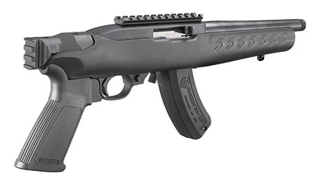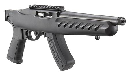 On top is a Picatinny rail for the optic of the buyer’s choosing. On the back is another Picatinny rail, for adding a side-folding brace. The grip is Ruger’s own, but any AR-style grip will fit, even with beaver tails. Overall length is just 17″, and it weighs just 52 ounces. A single BX-15 magazine is included, but all 10/22-compatible magazines will work. For bench or prone shooting, Ruger ships them with a little UTG rail-mount bipod as well. This nice touch includes an adapter for the sling stud. Just add an ammo and optic, and you’re ready for fun.
