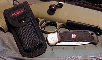 With its 3.380″ plain edge and 8Cr13MoV steel blade, the Accurate™is anything but exotic. When folded, it’s 4.644″ long, and 8.063″ when open. Forget about assisted opening, or even a thumb stud. It’s got a good old nail nick and a liner lock. And with all the options out there, the handle is pretty no-nonsense too. A thermoplastic elastomer over glass reinforced nylon gets the job done. One fancy touch is the Ruger medallion, inset on one side of the handle. On the included nylon sheath is the name Ruger, as well.