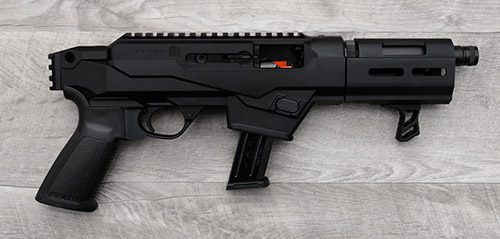 The back half of the chassis, which holds the 7075-T6 aluminum Type III hardcoat receiver, is glass-filled polymer. It’s got a 7075-T6 Picatinny rail on the tail for attaching a brace, which has been a popular accessory. While the factory grip is fine, it can be swapped for just about any AR-style grip. Yes, even ones with a beaver tail. In front of the trigger group is a flared magwell. Ruger ships it with an insert that takes the included Security 9 magazine. But it’s a quick job to swap it out for the included Glock-compatible magwell. A third option, for Ruger American pistol magazines, is available directly from Ruger.