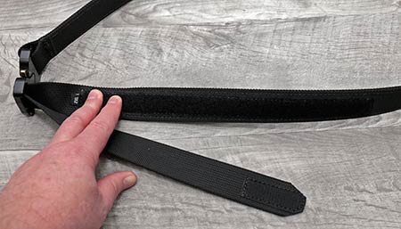 Due to the size of the buckle (2″), it’s necessary to unthread the belt from the buckle to get it through most belt loops. From there, the 1.5″ belt needs to be threaded through the belt loops, and back through the buckle. Finally, pull it snug and attach the hook and loop fastener section. It may take a few tries to get the perfect length. For IWB carry, don’t forget to leave a little extra room. In my case, I use this belt with a drop leg while shooting outdoors, so no extra room required.