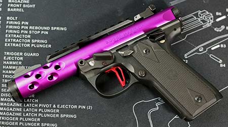 As part of our commitment to promoting recreational shooting as a family sport, I recently made a few changes to my collection. Between my wife, daughter, and myself, we all had different rimfire rifles and pistols. I felt it best if we all started with the same platform, so I bought some new pistols. I already had the Ruger MK IV 22/45 with the heavy barrel, and added a pair of Lite models. One is black, the other purple. After some discussion with TandemKross, a box of goodies was on its way. First to be modified was my wife’s purple Lite. Here’s how we set her up.