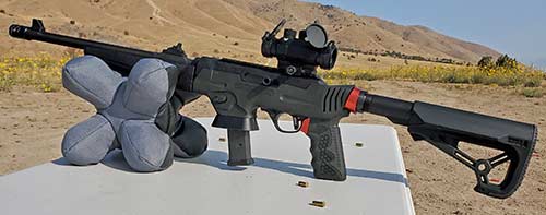 This is the first chassis I’ve seen that includes a grip. While any AR-style grip should work, TandemKross includes their hiveGrip for the AR. I have a similar grip on one of my Ruger 22/45 pistols, and it’s nice. The angle is a bit different from a standard AR grip, and I’m tempted to get one for another rifle I have. Finally, the feature that makes or breaks it for so many – the straight stock adapter. This too is available in either red or black. Considering all the controversy it’s created, it’s a very unassuming piece of machined aluminum. The important thing is that you can thread a receiver extension into it, and attach a stock (or brace, for your PC Charger) of your choice. I requested their $29.99 collapsible mil-spec stock and buffer tube. That’s in the photo above, which was a mockup for last week’s preview. Then a friend hooked me up with the Fab Defense stock in the photos below.