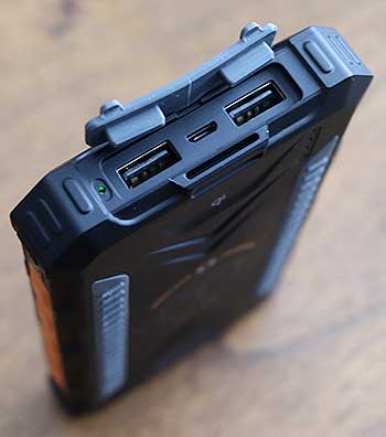 At 6.8 x 4.8 x 1.3 inches, it’s clearly bigger than a phone. But it’s not so big that you can’t find a pocket or place to stash it. If you’re hiking, you’ll want to attach it outside a pack, where the recessed solar panel can collect some light. (There’s a thin lashing point visible in the photo below) If you’re setting up camp, you can leave it in a position to catch sun all day. Then recharge your devices in the evening. Weight is just .80 pounds (12.8 ounces), which is respectable for the protective casing and battery capacity.